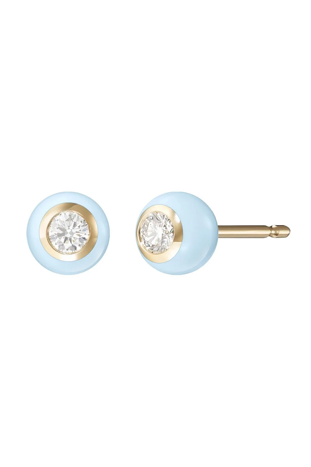 DETAILS AND INSIGHT Melissa Kaye small pastel blue audrey stud earrings in yellow gold. 18K Yellow Gold, Enamel 0.12cts diamonds 5.75mm Style E2321PB-Y