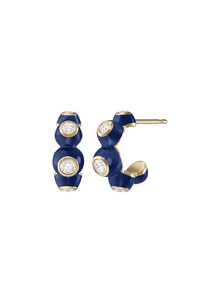 DETAILS AND INSIGHT Melissa Kaye navy audrey diamond huggie hoop earrings in yellow gold. 18K Yellow Gold, Enamel 0.58tcw Diamonds 14mm D Style E2331N-Y
