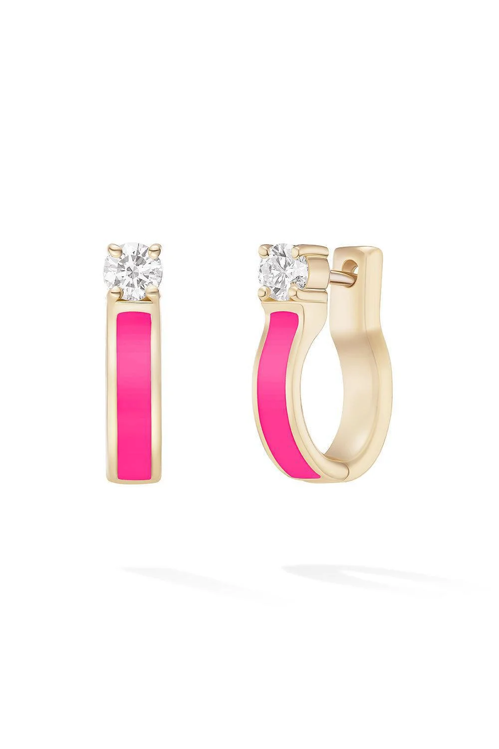 DETAILS AND INSIGHT Melissa Kaye small neon pink honey diamond hoop earrings in rose gold. 18K Rose Gold, Enamel Diamonds (0.34 tcw) 8mm D Style E2408C-P