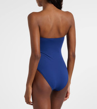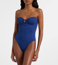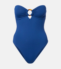 After working as a swimwear model, Melissa Odabash used her experience to create designs that are equal parts stylish and comfortable. The Barbuda swimsuit features a minimalist bandeau design elevated by an O-ring detail. Product Details - Material: 86% polyamide, 14% elastane - Care instructions: hand wash - Made in Italy - Designer color name: Marine Gold Ring - Item color: blue - Hardware color: brown - Padded cups - Includes: dust bag - Item number: P01130244 Size & Fit - True to size - Please note: small cups - Removable padding - Padded top - High-cut leg - If you wear a C cup or bigger, we recommend trying one size larger - The model seen in the picture is 178cm-5'10", cup size %cupsize%, and wearing a size IT 40