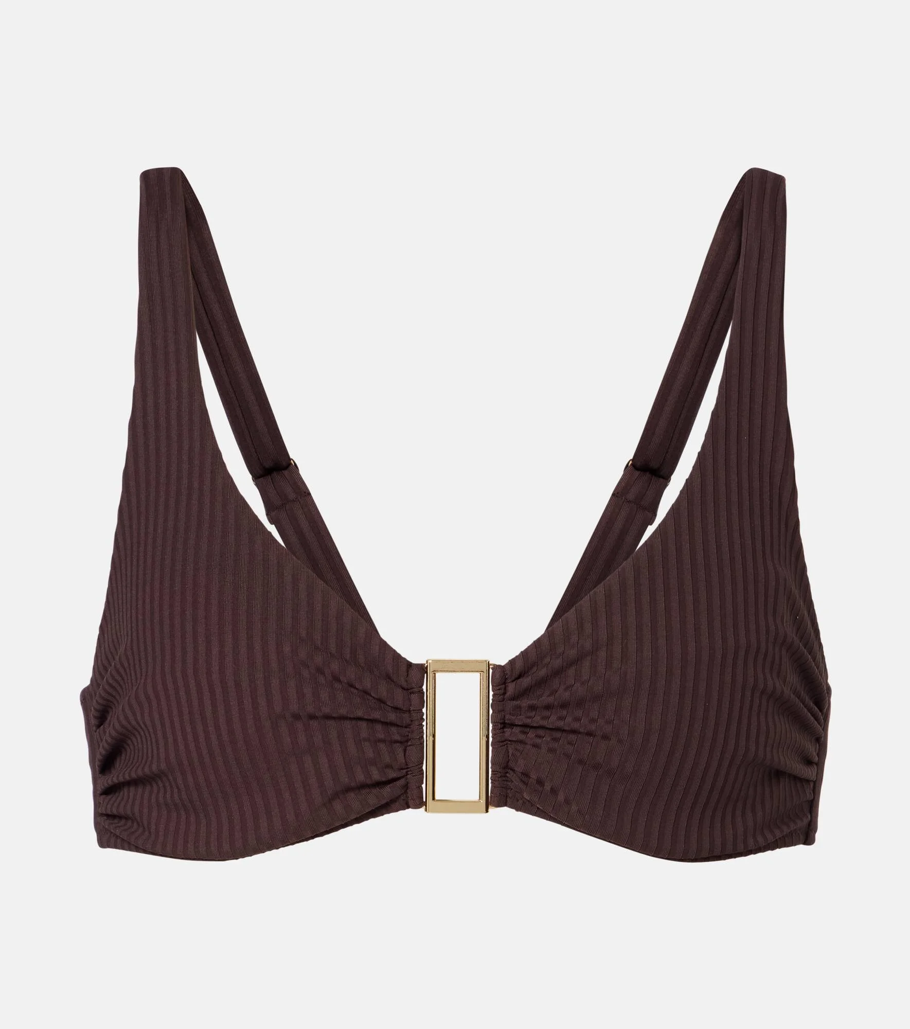 Melissa Odabash's signature Bel Air bikini top is reimaged in a premium ribbed fabric with added SPF 50+ protection. The brown design has underwiring and adjustable straps for support and fit. Product Details - Material: 86% polyamide, 14% elastane - Care instructions: hand wash - Made in Italy - Color: brown - Designer color name: Brown Ribbed - Item color: brown, gold - Adjustable shoulder straps - Closure: clip fastening - Includes: garment bag - Underwired cups - Item number: P01130234 Size & Fit - True to size - Underwired top - Unpadded Top - The model seen in the picture is 178cm-5'10", cup size B, and wearing a size IT 40