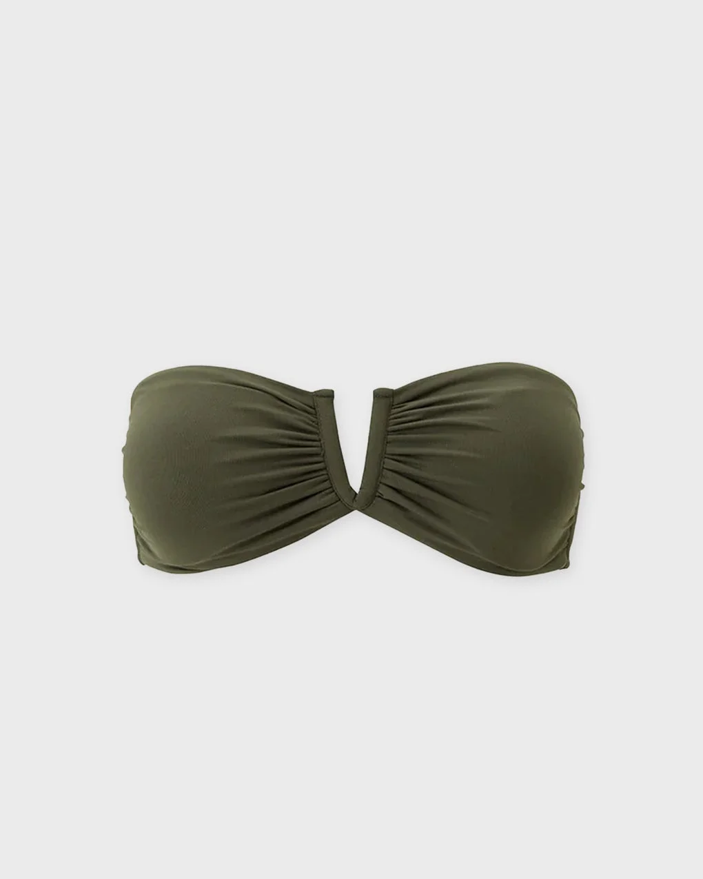 Bikini Top Alba from Melissa Odabash. The Alba bikini top in olive is a sleek and timeless choice for sunny getaways. It features a chic bandeau silhouette with a structured V-front detail, removable pads for a flattering shape, and a sleek clasp closure at the back. Size and Fit - Fits true to size, choose your usual size - The model is 175 cm tall and is wearing size 36 Specification - Article number - ID: 178360-635 - Brand: Melissa Odabash - Color: Olivgron - Washing Instructions: Hand wash - Made of: 86% Polyamide, 14% Elastane