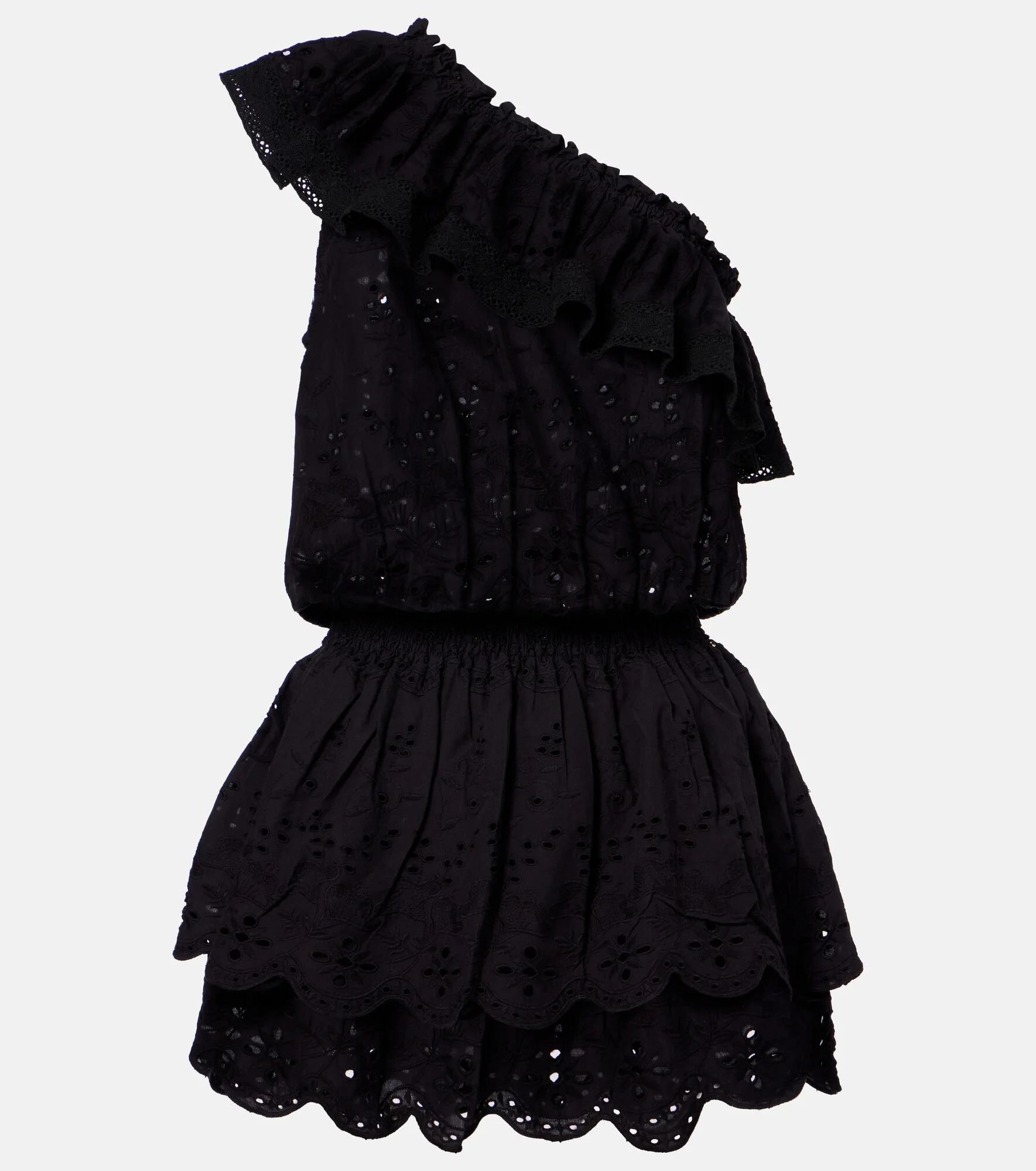 The Bree dress from Melissa Odabash is cut from cotton to a mini-length silhouette. This design is complemented by a ruffled one-shoulder, a flattering shirred waist, and broderie anglaise detailing throughout. Product Details - Material: 100% cotton - Care instructions: hand wash - Made in India - Color: black - Designer color name: Black - Elasticated waistband - Hem: scalloped - Item number: P01165098 Size & Fit - True to size - Cinched waist - Elasticated waist - Non-stretchy fabric - The model seen in the picture is 178cm-5'10" and wearing a size XS