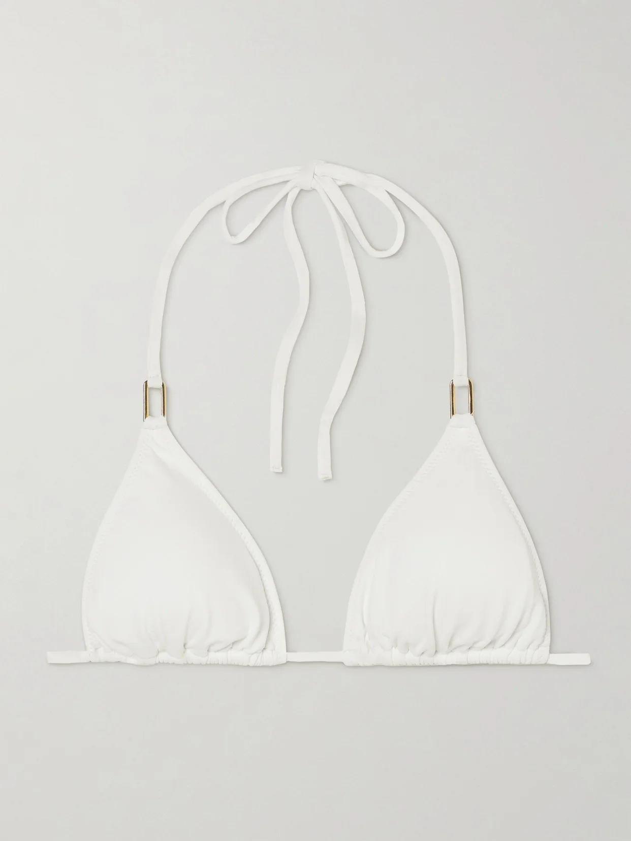 The only thing to challenge the brilliance of white sand beaches on vacation will be the pristine white of the Italian stretch fabric used to make Melissa Odabash's 'Cancun' bikini. Defined by a triangle cup profile, it secures with slender ties at the neck and back, and is embellished with sleek gold hardware. Find the matching briefs in our edit.