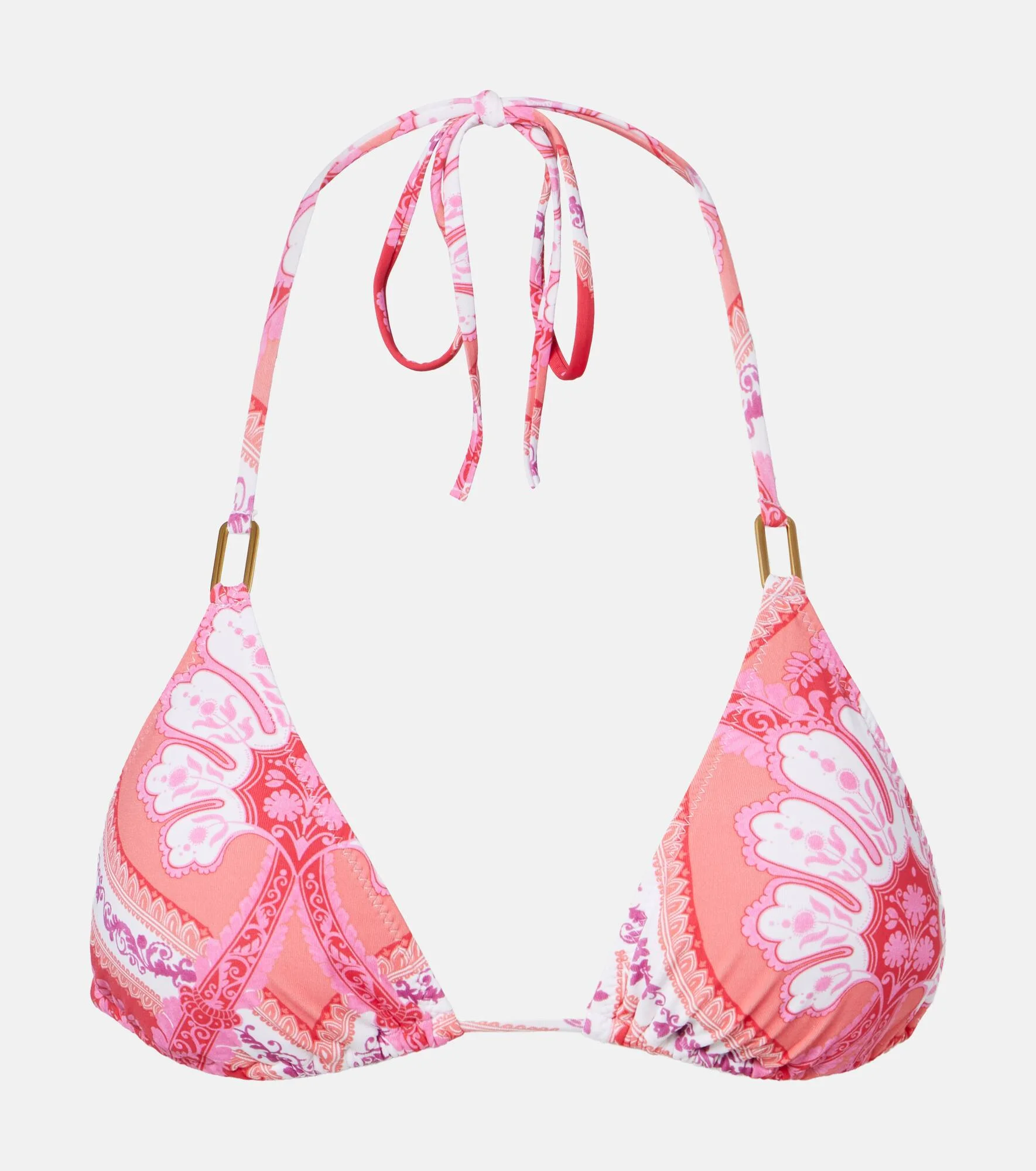 After working as a swimwear model, Melissa Odabash used her experience to create designs that are equal parts stylish and comfortable. The Cancun bikini top is a classic triangle style with removable padding and a colorful print. Product Details - Material: 86% polyamide, 14% elastane - Care instructions: hand wash - Made in Italy - Color: red - Designer color name: Ornate - Self-tie neck and back - Hardware color: gold - Removable cup padding - Includes: garment bag - Item number: P01165607 Size & Fit - True to size - Removable padding - The model seen in the picture is 178cm-5'10", cup size B, and wearing a size IT 40