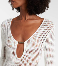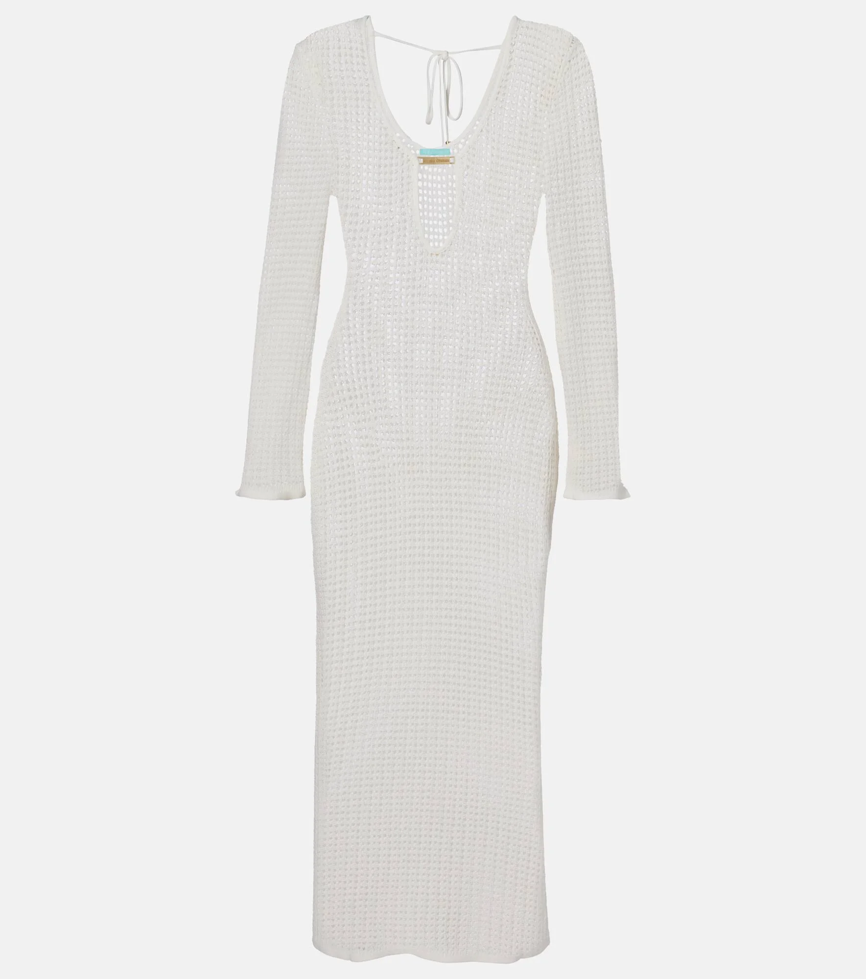 Opt for the Casey midi dress by Melissa Odabash when packing for your next dreamscape. Elegant and comfortable at once, the style features an open-knit construction and an alluring cutout at the chest. Product Details - Material: 65% viscose, 35% nylon - Care instructions: hand wash cold - Made in China - Designer color name: White - Item color: white - Hardware color: gold - Self-tie back - Side slits - Item number: P01125403 Size & Fit - True to size - Semi-sheer - Fitted - Slightly stretchy fabric - The model seen in the picture is 178cm-5'10" and wearing a size XS