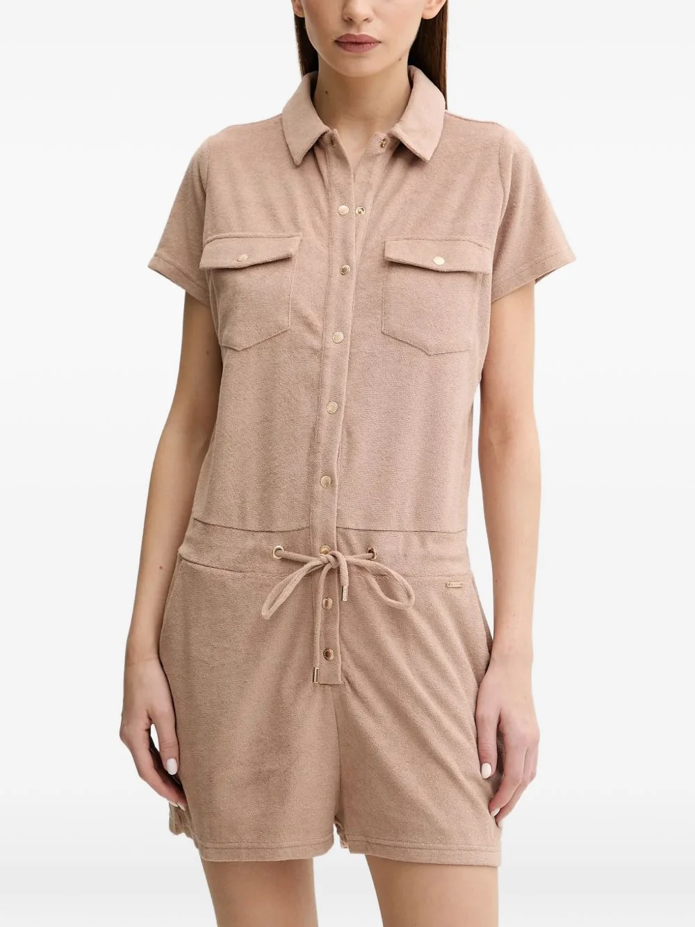 Cheryl buttoned drawstring playsuit Highlights - Almond - Point collar - Chest flap pockets - Short sleeves - Drawstring waist - Front button fastening Imported Composition Fabric 100%