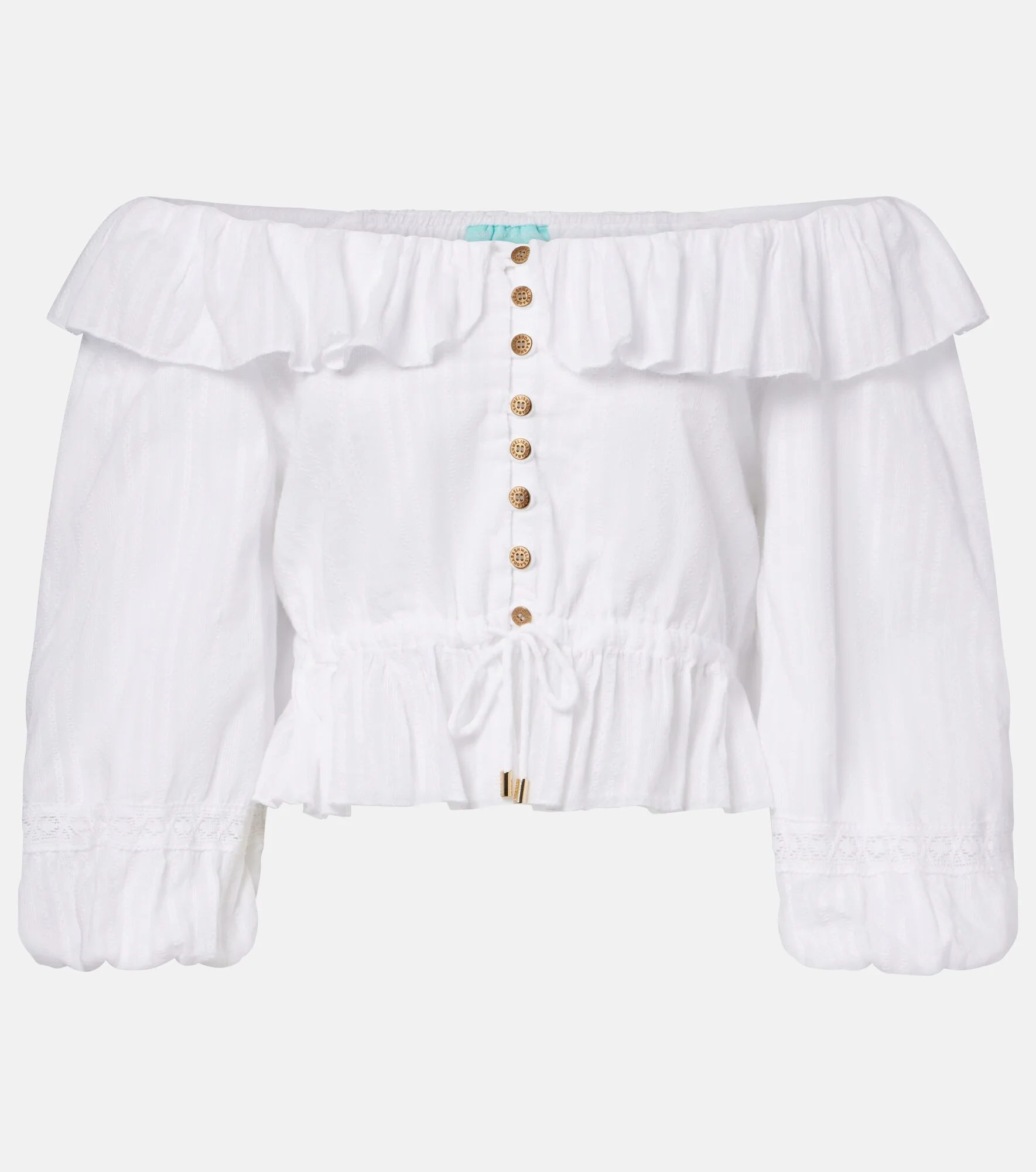 After working as a model, Melissa Odabash used her experience to create designs that are equal parts stylish and comfortable. The Corrine blouse has a romantic off-shoulder silhouette and pure cotton poplin construction. Product Details - Material: 100% cotton - Care instructions: hand wash - Made in India - Color: white - Designer color name: White - Drawstring waist - Closure: buttoned front - Cuff: elasticated - Item number: P01165622 Size & Fit - True to size - Off-the-shoulder - Loose fit, elasticated waist - Adjustable at the waist - Non-stretchy fabric - Slightly cropped - The model seen in the picture is 178cm-5'10" and wearing a size XS