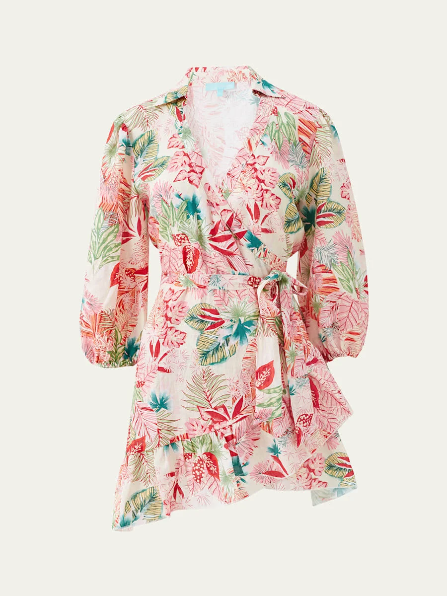 Melissa Odabash "Izzy" dress in a tropical hawaiian print with ruffled trim detailing Collared V neckline 3/4 sleeves with elasticated cuffs Self-tie sash belt Hem falls above the knee Wrap silhouette Viscose/linen Unlined Hand wash Imported Online Inquiries: BGS21_T6MWR| Store Inquiries: #5014254