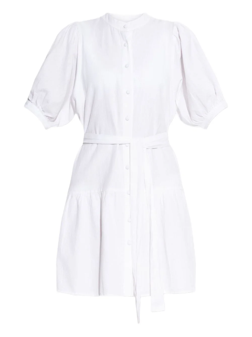 Kinly mini dress Highlights - White - Front button fastening - Belted waist - Buttoned cuffs - Short puff sleeves Imported Composition Cotton 80%, Linen/Flax 20%