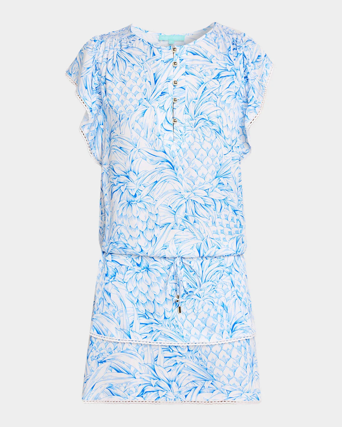 Finished with golden dome buttons and crochet trim, Melissa Odabash & apos;s "Lenni" tiered dress is printed with a playful pineapple print Crew neckline Flowing cap sleeves Adjustable drawstring waistband Hem falls above the knee Slipover style Viscose Hand wash Imported SIZE & FITModel measurements: 5 & apos;10" tallModel is wearing a US size 4/Small