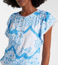 Build your destination wardrobe with fresh pieces like the Paige shirt from Melissa Odabash. Breezy, lightweight, and playful, this tiered style features a floral-inspired all over print. Product Details - Material: 100% viscose - Care instructions: dry clean - Made in China - Designer color name: Florian - Item color: white, blue - Hardware color: gold - Closure: buttoned placket - Elasticated drawstring waist - Hem: scalloped - Item number: P01125396 Size & Fit - True to size - Loose fit, drawstring waist - Non-stretchy fabric - The model seen in the picture is 178cm-5'10" and wearing a size XS