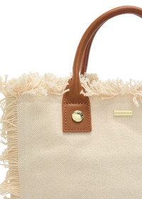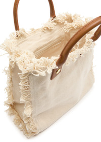 Info & Care Melissa Odabash canvas tote Leather top handles, frayed trims, designer plaque, engraved hardware, feet, internal zip pocket, two internal patch pockets; Open top 100% cotton Spot clean Size & Fit Width: 10.5 inches/ 26.5cm Height: 9 inches/ 23cm Depth: 5.5 inches/ 14cm Top handle drop: 4.5 inches/ 11.5cm