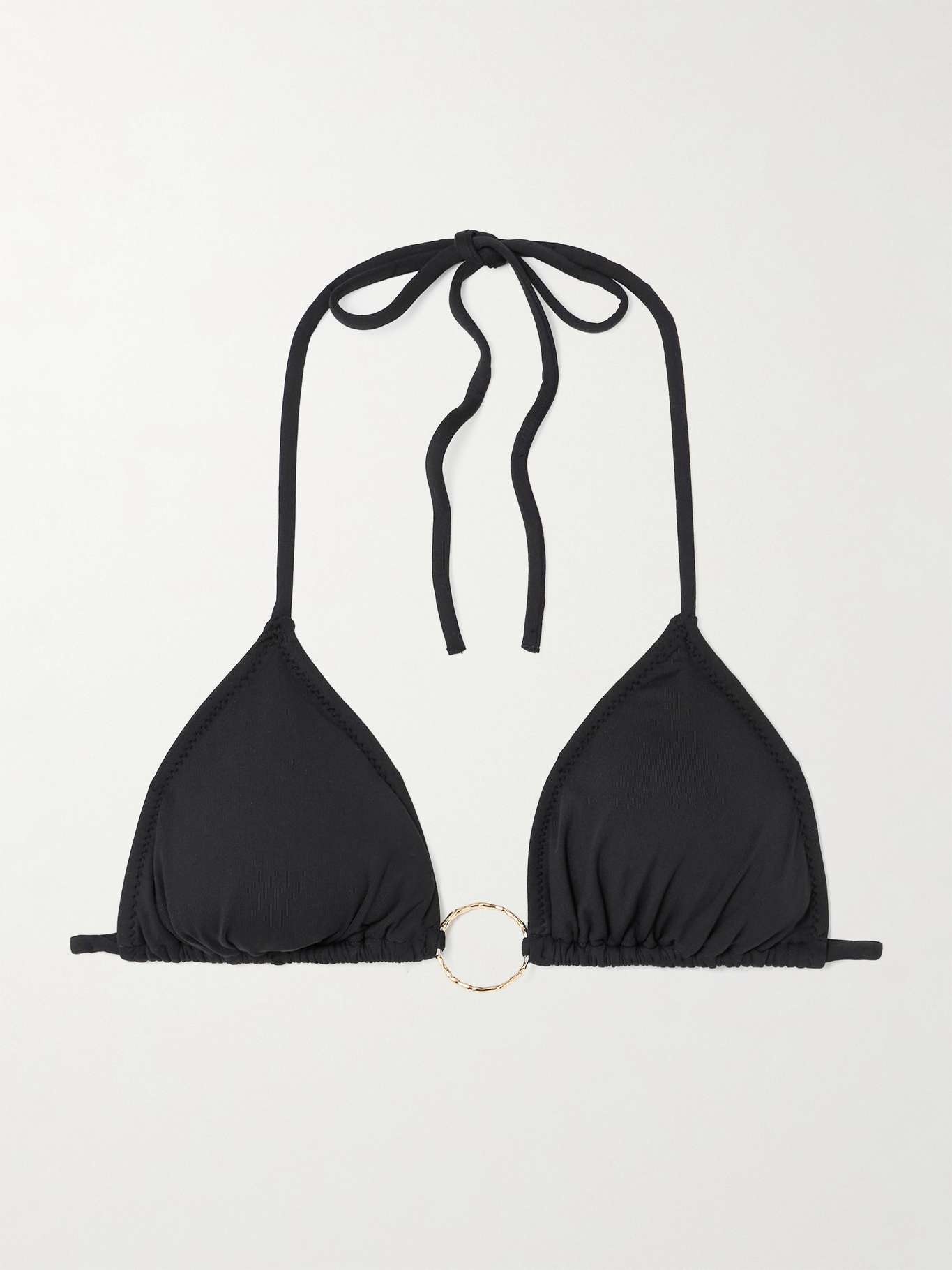 EDITORS'NOTES Melissa Odabash’s understated ‘Miami’ bikini top is centered with a hammered gold-tone ring that connects the triangle cups. It's made from stretch fabric and has adjustable ties and removable padding. Complete the set with the matching briefs. SIZE & FIT Model measurements: - Fits true to size, take your normal size - Triangle style - Model is 175cm/ 5'9", bra size 30D and is wearing a UK 10 - Bust: 79cm/ 31” - Waist: 61cm/ 24” - Hip: 91cm/ 36” DETAILS & CARE - Black stretch-polyamide - Ties at neck and back - 86% polyamide, 14% elastane - Hand wash - Lotion, sunscreen, oil and chlorine can cause discoloration of this item; this is not a manufacturing defect. Please follow care instructions to keep your swimwear in the best condition