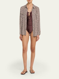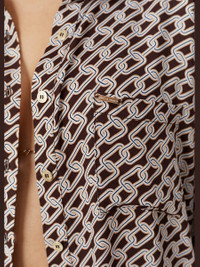Melissa Odabash "Millie" jungleprinted shirt with branded golden buttons Spread collar; button front Long sleeves Yoked back Hip length Relaxed, loose fit Viscose Imported