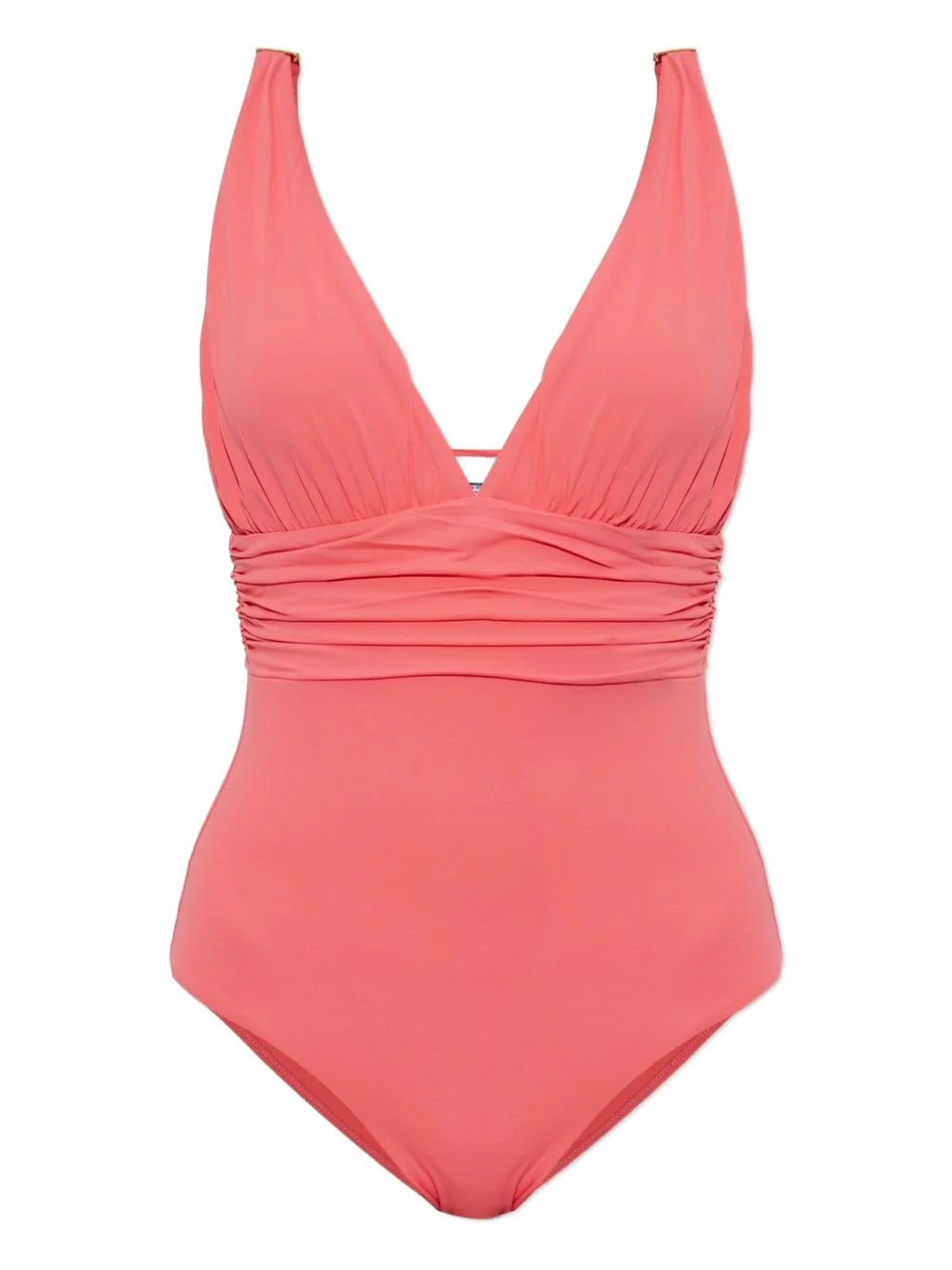 Panarea ruched-detail swimsuit Highlights - Pink - V-neck - Ruched detailing - Adjustable straps - Be mindful to try on swimwear over your own garments. Made in Italy Composition Polyamide 86%, Elastane 14% Washing instructions Read Manufacturer Guidelines