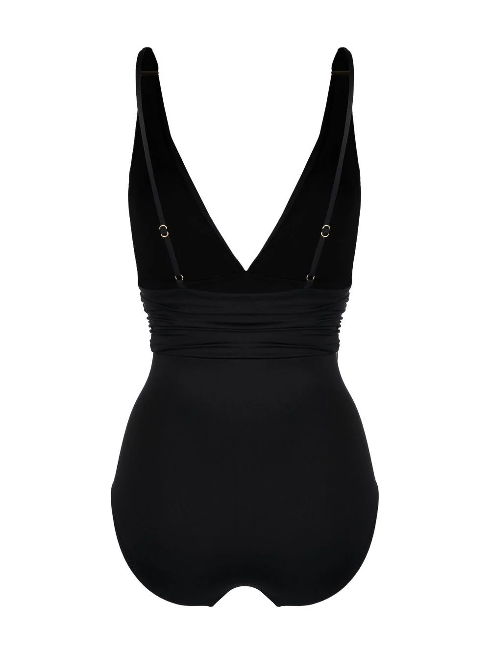 Panarea ruched swimsuit black stretch-design ruched detailing plunging V-neck adjustable shoulder straps open back sleeveless Be mindful to try on swimwear over your own garments. Made in Italy Composition Polyamide 91%, Spandex/Elastane 9%