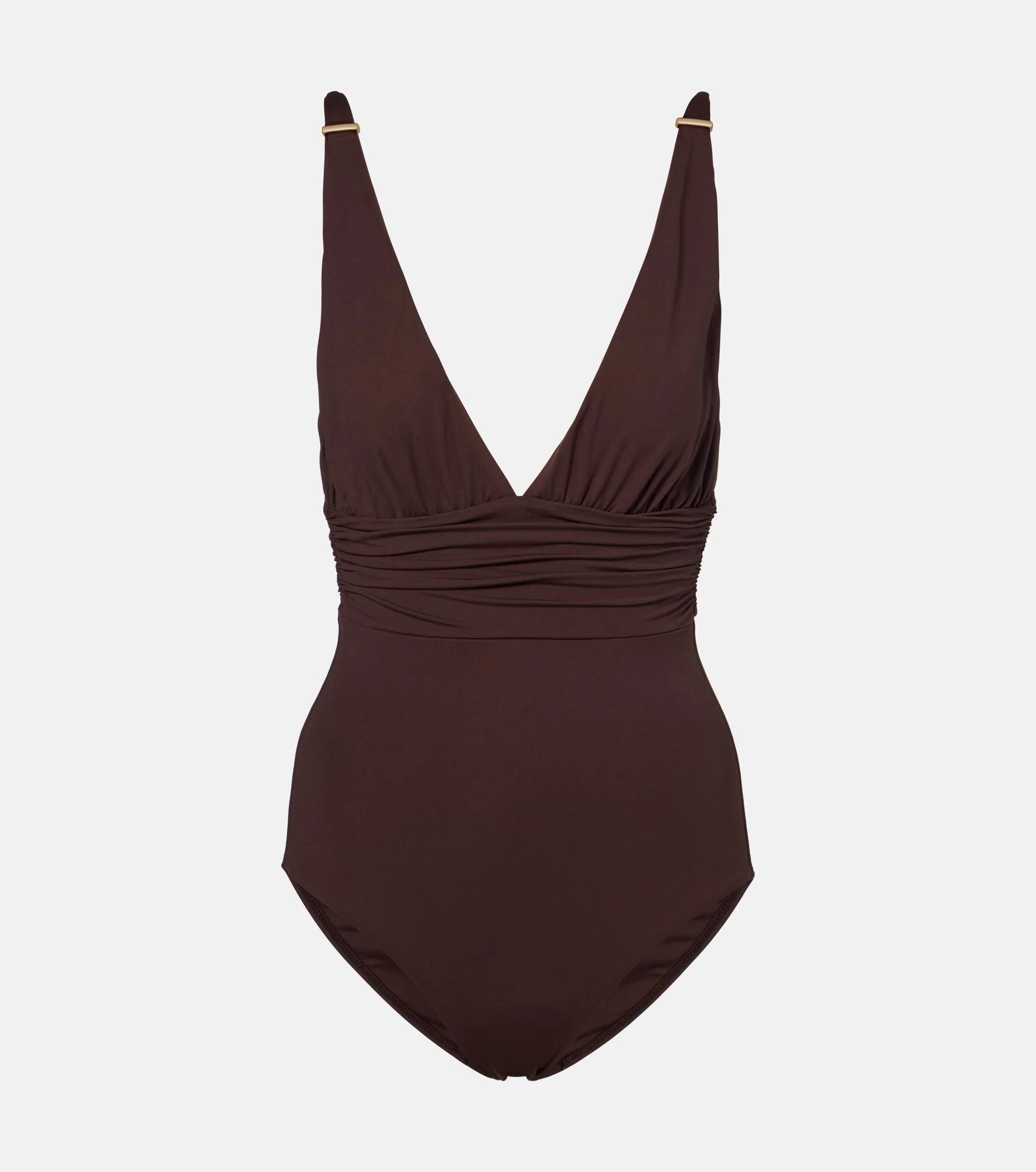 Melissa Odabash’s Panarea swimsuit is essential for escapist edits. This one-piece features flattering ruching, adjustable shoulder straps, and a plunging V-neckline for an unparalleled fit. Product Details - Material: 86% polyamide, 14% elastane - Care instructions: hand wash - Made in Italy - Designer color name: Brown - Item color: brown - Includes: dust bag - Hardware color: gold - Adjustable shoulder straps - Item number: P01125433 Size & Fit - True to size - Removable padding - Medium-cut leg - The model seen in the picture is 178cm-5'10", cup size B, and wearing a size IT 40