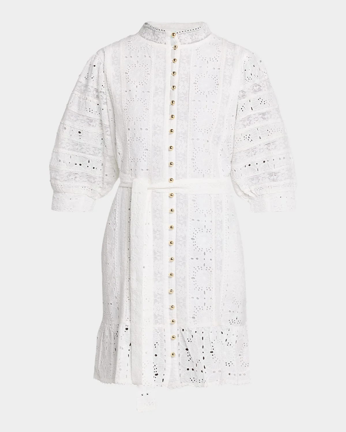 Crafted from an eyelet fabric, Melissa Odabash & apos;s "Reagan" shirtdress is finished with intricate crochet insets High neckline Elbow-length sleeves Self-tie sash belt Side seam pockets Hem falls above the knee Tiered skirt Button front closure Cotton/linen Hand wash Imported SIZE & FITModel measurements: 5 & apos;10" tallModel is wearing a US size 4/Small