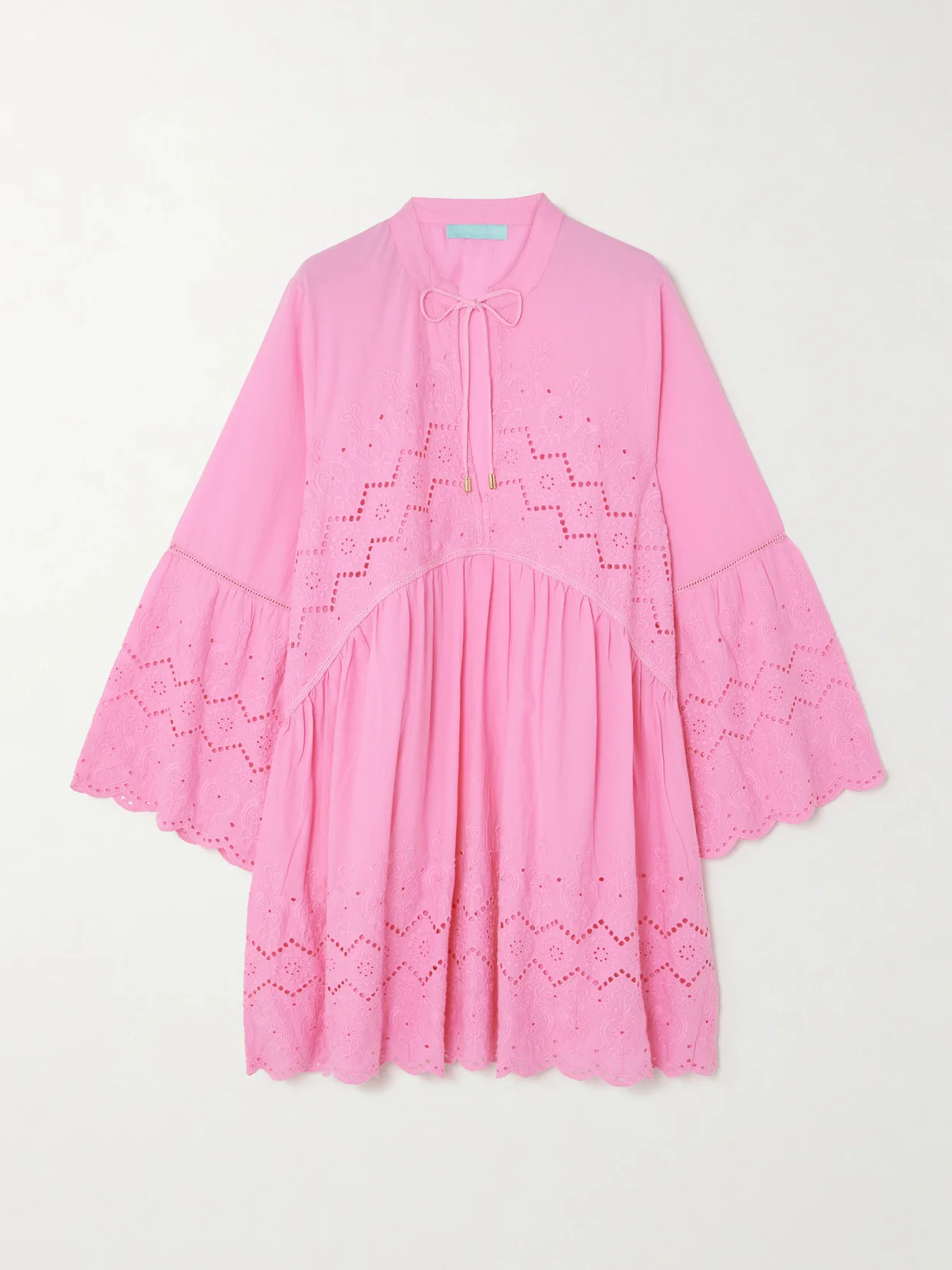 The pretty pink shade of Melissa Odabash's 'Sebenna' kaftan will fit in perfectly on tropical getaways. Made from lightweight cotton, it's detailed with intricate broderie anglaise and has a floaty shape and wide sleeves. Leave the neck ties undone or fasten them into a sweet bow.