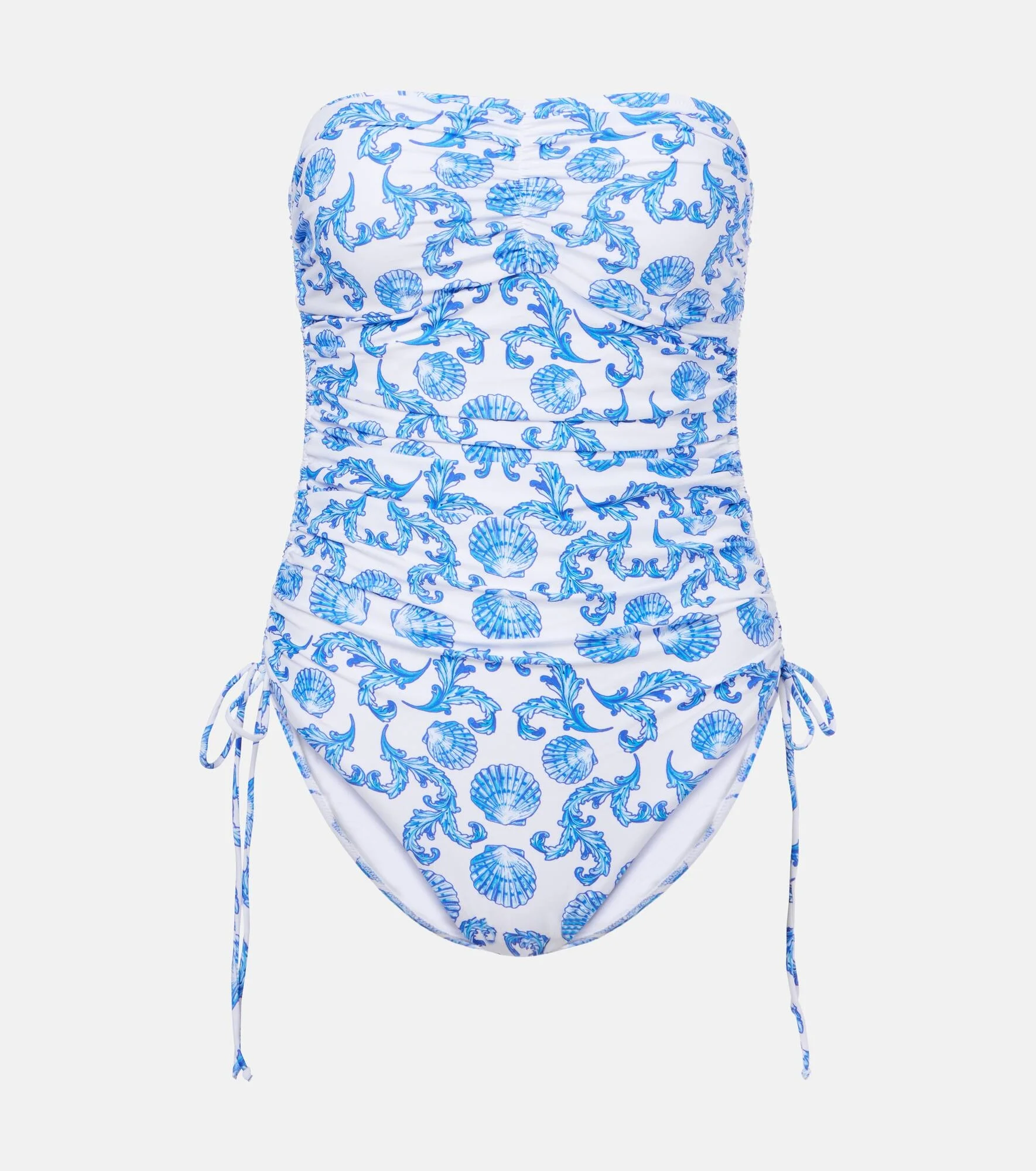 After working as a swimwear model, Melissa Odabash used her experience to create designs that are equal parts stylish and comfortable. The Sydney printed swimsuit is a chic bandeau design that features flattering ruching throughout. Product Details - Material: 86% polyamide, 14% elastane - Care instructions: hand wash - Made in Italy - Designer color name: Blue Shell - Item color: multicolor, blue, white - Item number: P01041625 Size & Fit - True to size - Strapless - Removable padding - High-cut leg - The model seen in the picture is 178cm-5'10", cup size B, and wearing a size IT 40