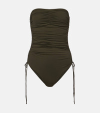 After working as a swimwear model, Melissa Odabash used her experience to create pieces that are equal parts stylish and comfortable. Designed with SPF 50+ protection, the Sydney swimsuit features a strapless silhouette with all-over ruching and detachable padding. Product Details - Material: 86% polyamide, 14% elastane - Care instructions: hand wash - Made in Italy - Designer color name: Olive - Item color: green - Removable cup padding - Closure: drawstring - Includes: dust bag - Item number: P01125432 Size & Fit - True to size - Strapless - Removable padding - Medium-cut leg - The model seen in the picture is 178cm-5'10", cup size B, and wearing a size IT 40