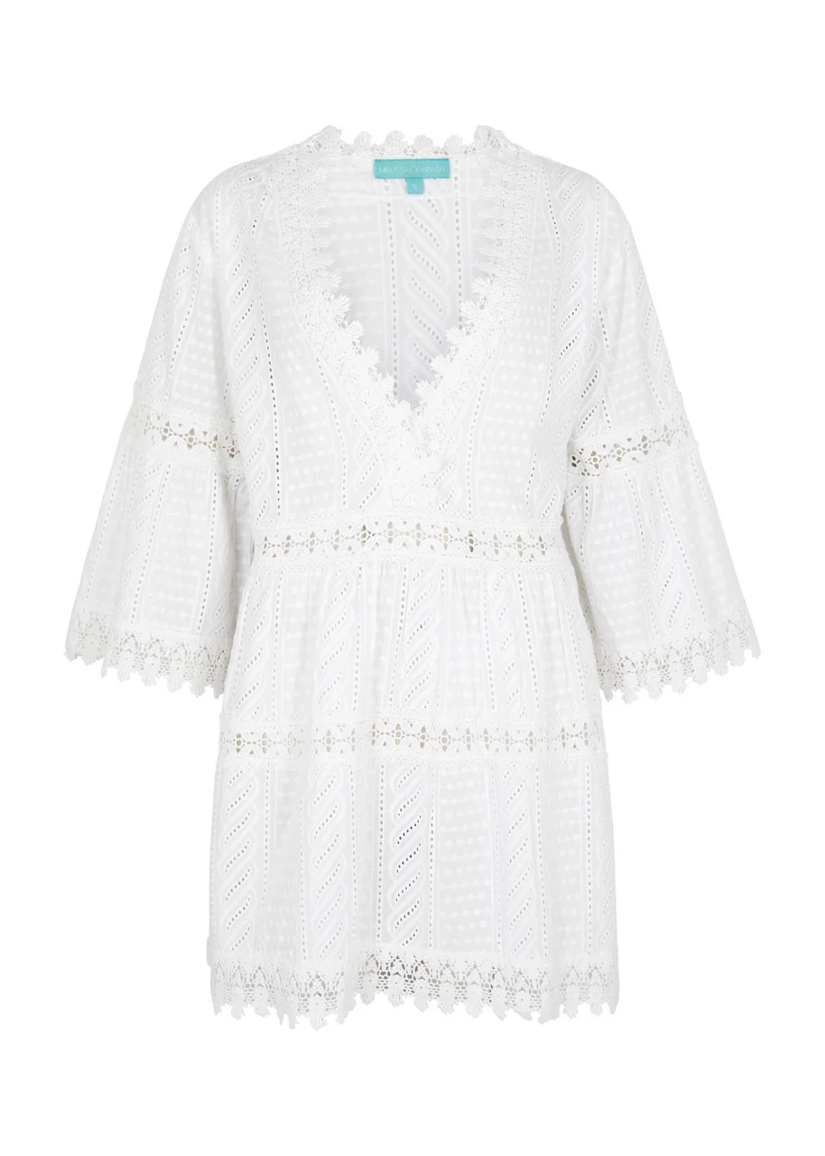 INFO & CARE - Melissa Odabash cotton kaftan - Broderie anglaise wrap-effect front plunge V-neck dropped shoulders flared sleeves tiered lace trims and inserts scalloped trims - Slips on - 100% cotton - Machine wash SIZE & FIT - Length shoulder to hem: 33 inches/ 84cm - Midweight - Loose fit - Model is 5'9"/ 175cm and wears a size small