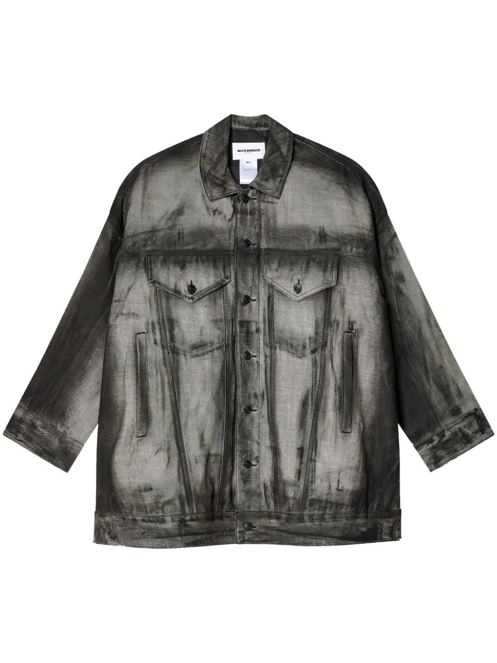distressed-finish denim jacket Highlights - Black/beluga grey - Cotton - Distressed finish - Front button fastening - Spread collar - Two chest flap pockets - Two side slit pockets - Long sleeves - Buttoned-cuff sleeves - Straight hem - When buying this unisex item, keep in mind that it is graded in standard men's sizing. Made in United States Composition Cotton 100%