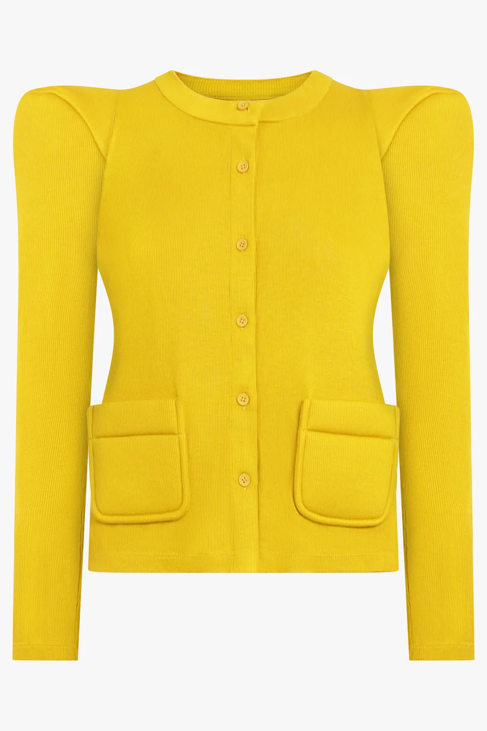 A statement piece redefining modern tailoring, the Foamy Shoulder Cardigan Jacket in Gold showcases a sculptural silhouette with a striking yellow. Designed with structured, foamy shoulders that add volume and architectural shape, this piece blends the comfort of a cardigan with the refinement of a jacket, making it perfect for both evening occasions and elevated daywear. - Structured, foamy shoulders create a bold, sculpted silhouette - Soft, cardigan-inspired body offers comfort and ease of movement - Metallic gold hue adds a vibrant, standout touch - Fits true to size with a tailored yet comfortable shape - Versatile gold shade elevates any wardrobe Style with jeans or a skirt for a polished contemporary off-duty look. Size and Fit Tiah: Model is 178cm/5’9” and is wearing a size S Model Measurements: Bust: 86cm, Waist: 69cm, Hips 90.5cm Fits true to size