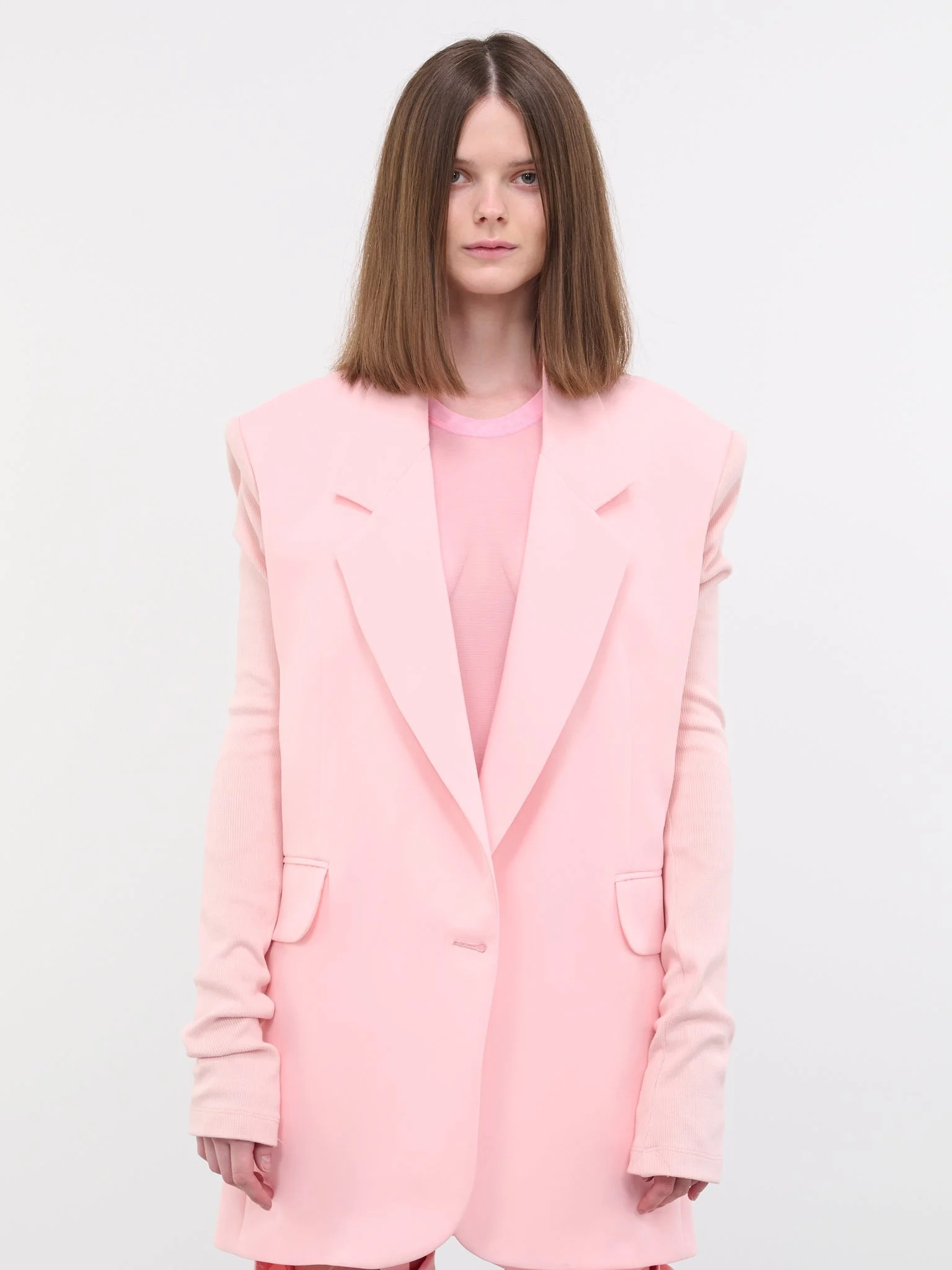 MELITTA BAUMEISTER jacket in pink, paneled design, oversized silhouette, notched lapel collar, padded shoulders, button closure, elongated knit sleeves, relaxed fit. US Sizing Model is 5'10" wearing size 42. Bust: 32" Waist: 24" Hips: 35"