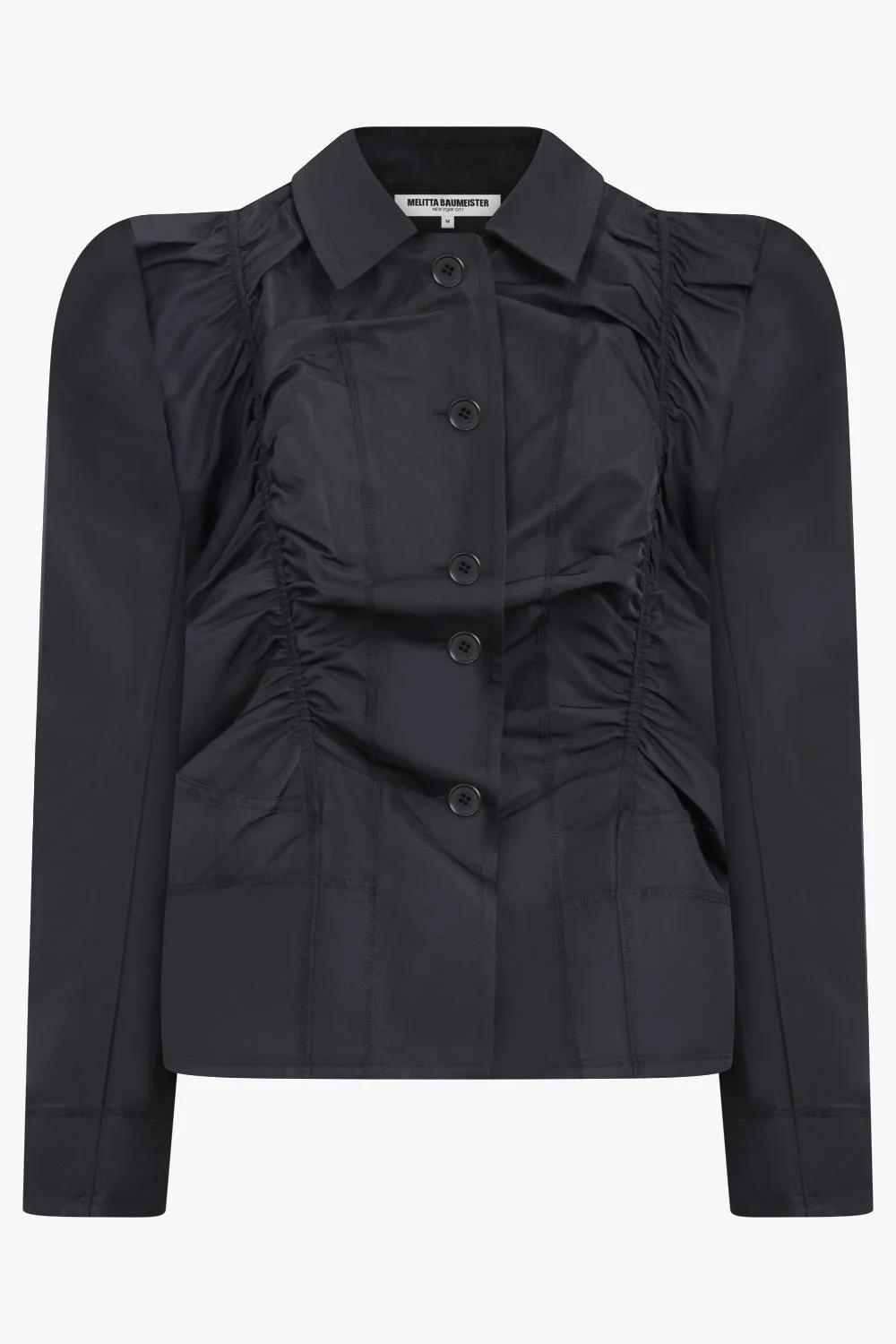 A statement piece that merges sculptural tailoring with feminine structure, the Ruched Front Puff Shoulder Jacket in Black showcases Baumeister’s signature architectural aesthetic. Crafted from a sleek black fabric, this jacket features gathered ruching through the front and sides, creating a cinched, form-enhancing silhouette. The strong, rounded puff shoulders add dramatic volume and contrast against the fitted waist, while the structured hem subtly flares to accentuate the shape. - Puff shoulder construction for a bold, sculptural silhouette - Ruched front detailing for a cinched, contoured fit - Pointed collar and button-down front for a refined, tailored finish - Slightly flared hemline for balance and movement - Classic black colourway for timeless versatility Style it with the Quilted A-Line Midi Skirt or tailored trousers for a sophisticated, directional ensemble. Size and Fit Tiah: Model is 178cm/5’9” and is wearing a size M Model Measurements: Bust: 86cm, Waist: 69cm, Hips 90.5cm Fits true to size