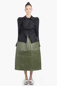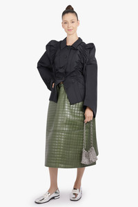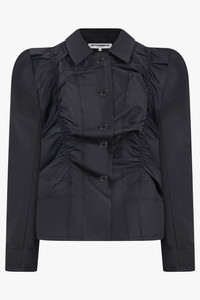A statement piece that merges sculptural tailoring with feminine structure, the Ruched Front Puff Shoulder Jacket in Black showcases Baumeister’s signature architectural aesthetic. Crafted from a sleek black fabric, this jacket features gathered ruching through the front and sides, creating a cinched, form-enhancing silhouette. The strong, rounded puff shoulders add dramatic volume and contrast against the fitted waist, while the structured hem subtly flares to accentuate the shape. - Puff shoulder construction for a bold, sculptural silhouette - Ruched front detailing for a cinched, contoured fit - Pointed collar and button-down front for a refined, tailored finish - Slightly flared hemline for balance and movement - Classic black colourway for timeless versatility Style it with the Quilted A-Line Midi Skirt or tailored trousers for a sophisticated, directional ensemble. Size and Fit Tiah: Model is 178cm/5’9” and is wearing a size M Model Measurements: Bust: 86cm, Waist: 69cm, Hips 90.5cm Fits true to size