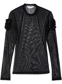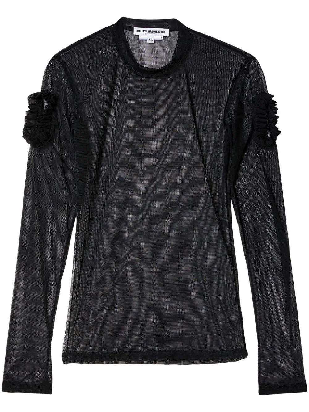 ruffled semi-sheer top Highlights - Black - Semi-sheer construction - Ruffled detailing - Floral applique - Crew neck - Long raglan sleeves - Straight hem Imported Composition Polyester 100%