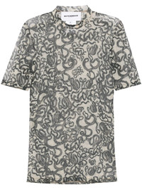 snake-print semi-sheer T-shirt Highlights - Black/light beige - Snake print - Semi-sheer construction - Crew neck - Short sleeves - Straight hem Made in United States Composition Lycra 100% SIZE & FIT Model measurements Height 5 ft 9 in(1.76 m) Bust/Chest 31.1 in(79 cm) Hips 35.03 in(89 cm) Waist 24.4 in(62 cm) FittingInformation Designed for a close fit throughout Made from a lightweight non-stretch fabric, this piece offers minimal elasticity when worn This piece fits true to size – take your usual size