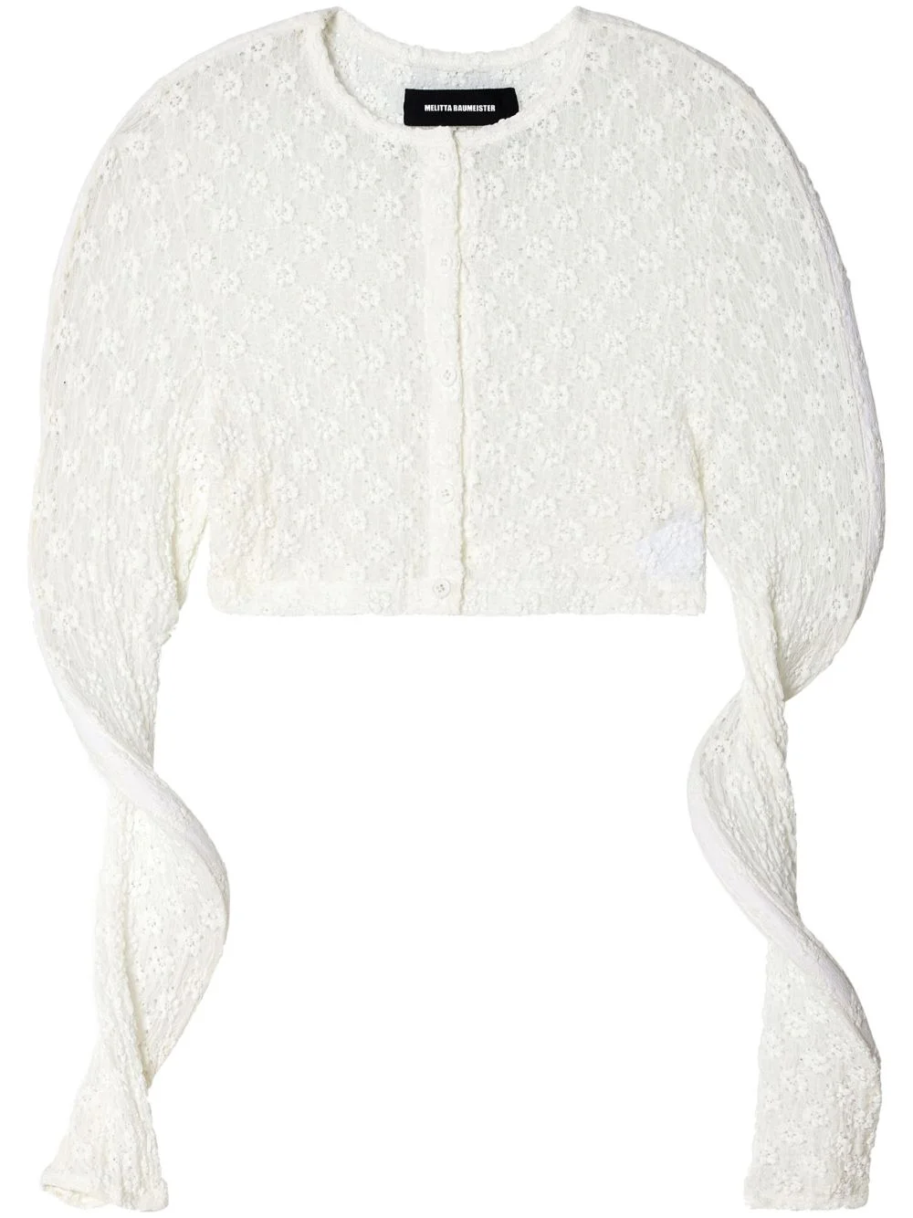 Spiral floral-embroidered cropped cardigan Highlights - White - All-over floral embroidery - Front button fastening - Round neck - Extra-long sleeves - Straight hem - Cropped Made in United States Composition Polyester 100%