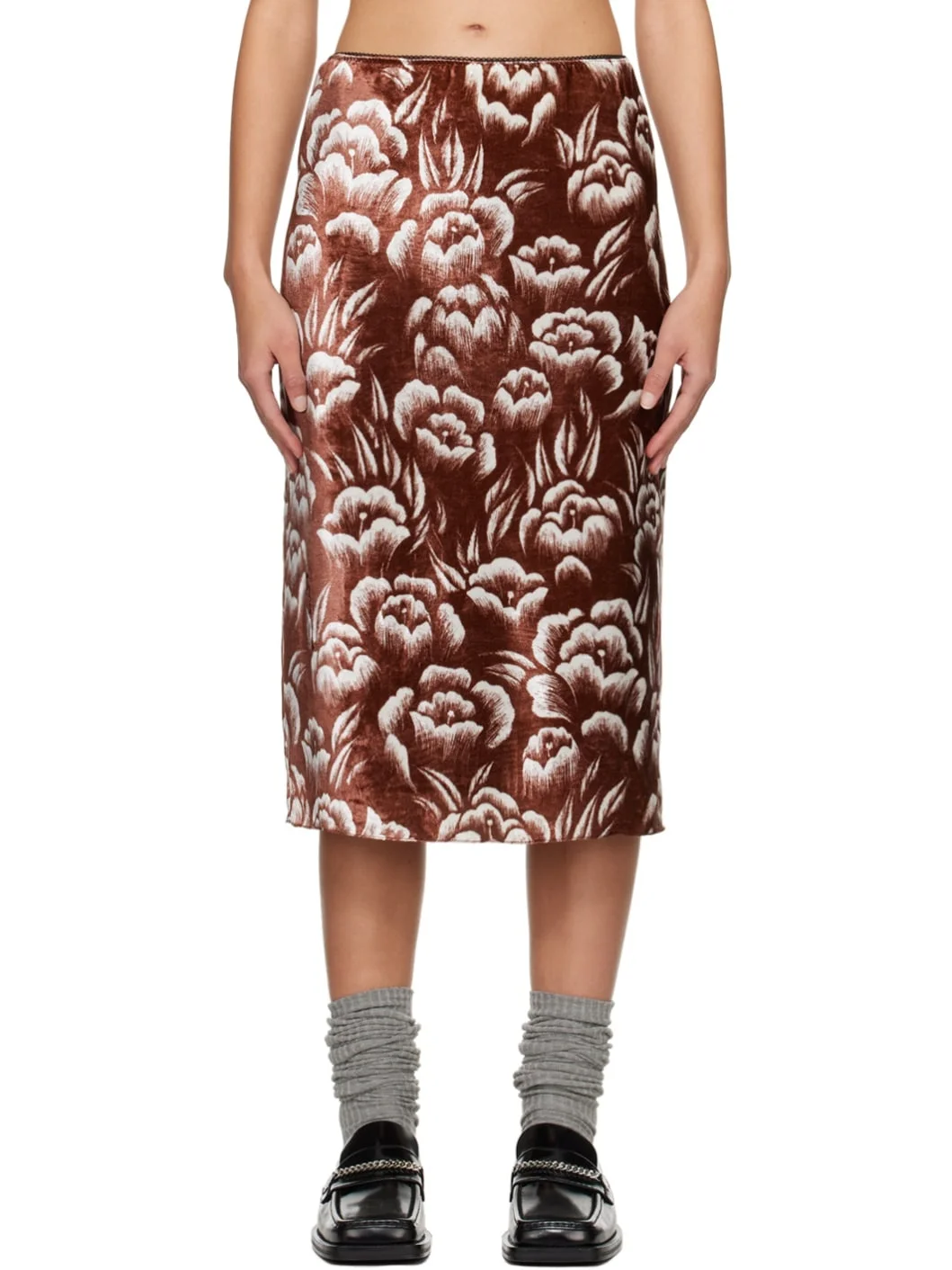 Viscose- and silk-blend velvet skirt. Floral pattern printed throughout. · Lace trim at waistband · Concealed zip closure at back · Central vent at back hem · Full viscose twill lining Supplier color: Lino flower/Brown Body: 82% viscose, 18% silk. Lining: 100% viscose. Made in Italy 241512F092000