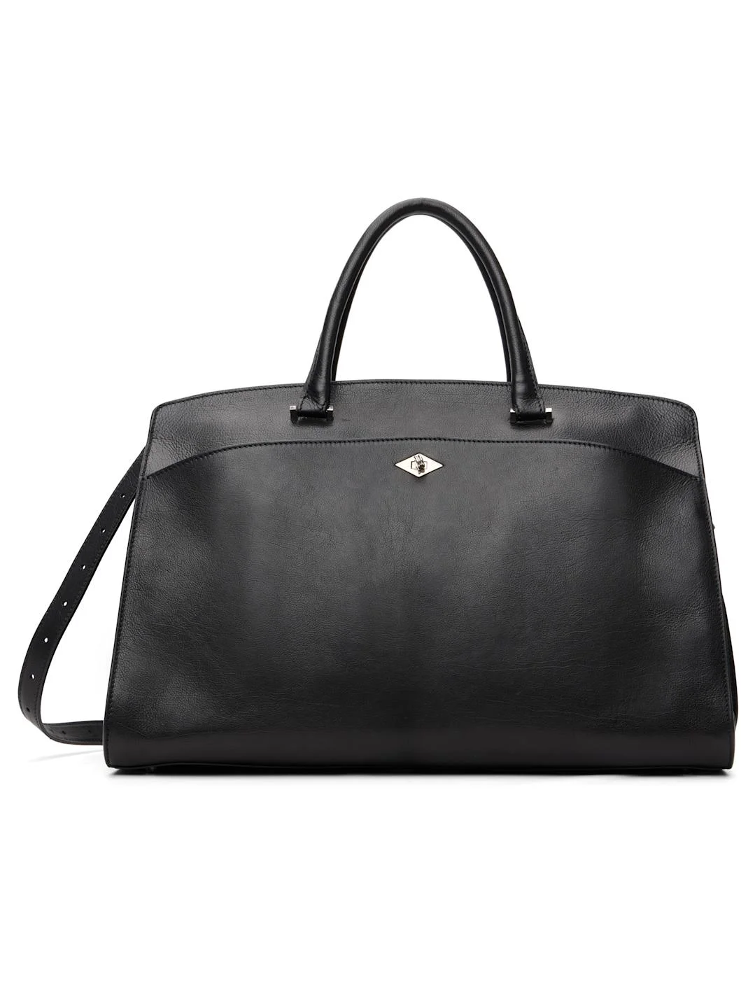 Grained leather carryall tote. Detachable interior compartment converts to crossbody pouch. · Rolled leather carry handles · Adjustable and detachable crossbody strap · Compartment with turn-lock closure at face · Pen and card slots, pocket, and phone compartment · Two-way zip closure · 14" laptop compartment and zip pocket at interior · H10" x W16.5" x D9" Supplier color: Marianne Leather Black Leather. Made in Italy 261270F049001