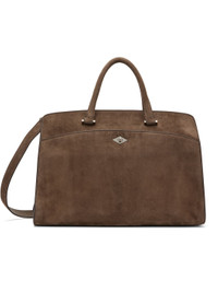 Calfskin suede carryall tote. Detachable interior-compartment divider converts to crossbody pouch. · Rolled leather carry handles · Single adjustable and detachable crossbody strap · Compartment with turn-lock closure at face · Pen and card slots, pocket, and phone compartment · Two-way zip closure · 13" laptop compartment and zip pocket at interior · Suede interior · Silver-tone hardware · H10" x W14" x D7" Supplier color: Clay Calfskin. Made in Italy 252270F049012