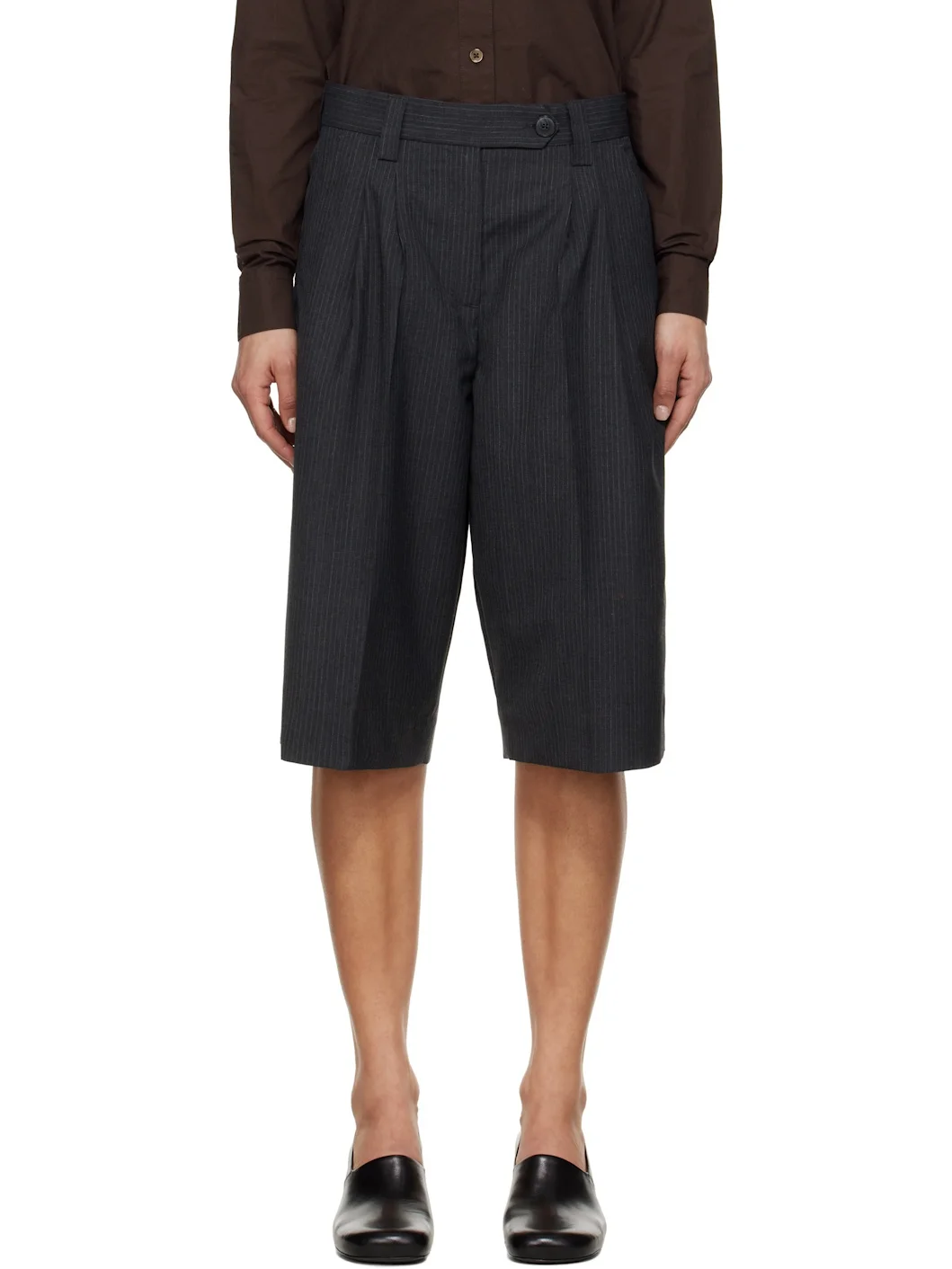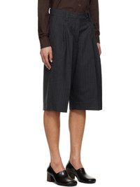 Wide-leg deadstock polyester- and virgin wool-blend twill shorts. Pinstripes throughout. · Mid-rise · Belt loops · Four-pocket styling · Zip fly · Pleats at front · Creased legs · Darts at back waistband Supplier color: Dark grey pinstripe 55% polyester, 24% virgin wool. Made in Bulgaria 251505F088002