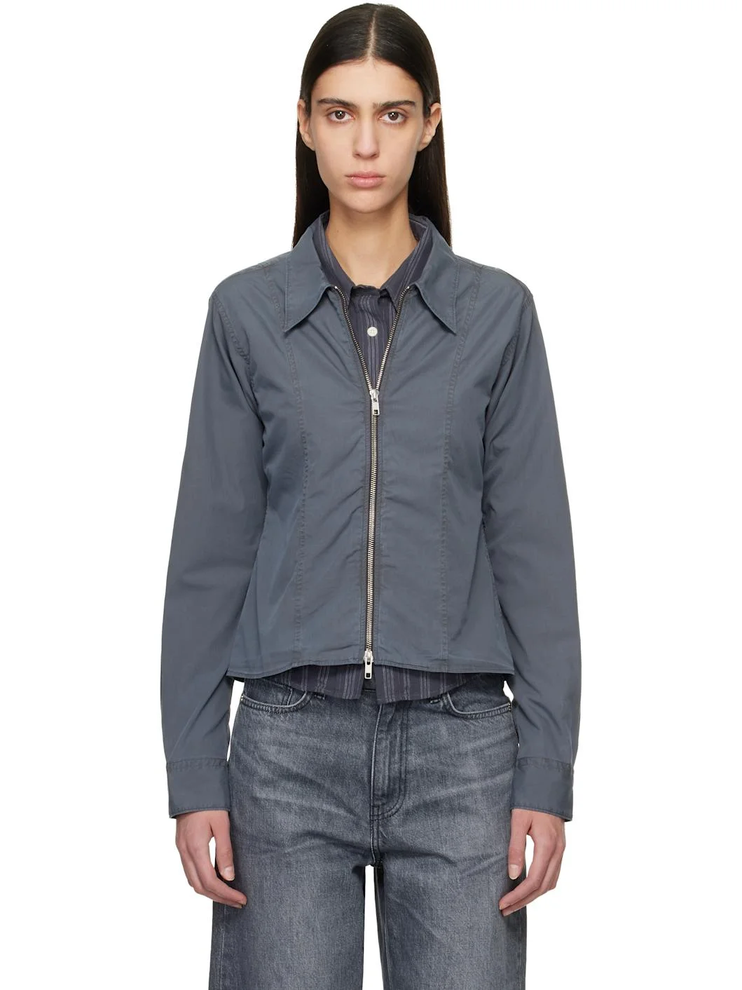 Organic cotton poplin shirt. · Garment-washed · Paneled construction · Spread collar · Zip closure · Cropped hem · Pleat at adjustable buttoned barrel cuffs · Resin hardware Supplier color: Washed graphite 100% organic cotton. Made in Portugal 252505F109000