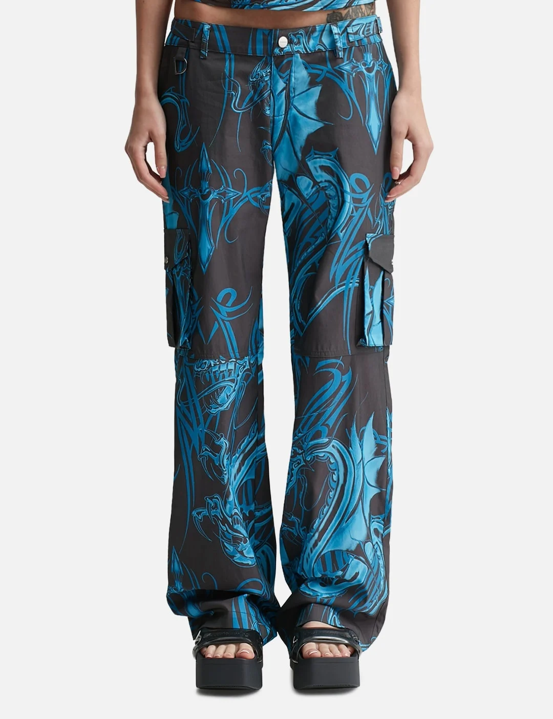 - Miaou - Elias Cargo Pants - Cotton-nylon blend exterior in all-over graphic print - Low rise - Two side pockets; two cargo pockets - Two rear pockets - Color: Tattoo Blue - Material: Cotton, Nylon, Spandex - See more Pants and Clothing SIZING - Model wears size S - Model measures: Height 175cm, Chest 33”/83.8cm, Waist 23”/58.4cm,Hip 34”86.4cm