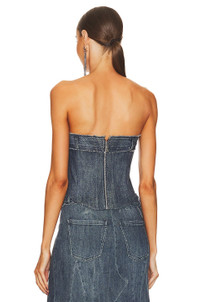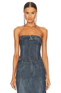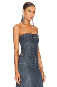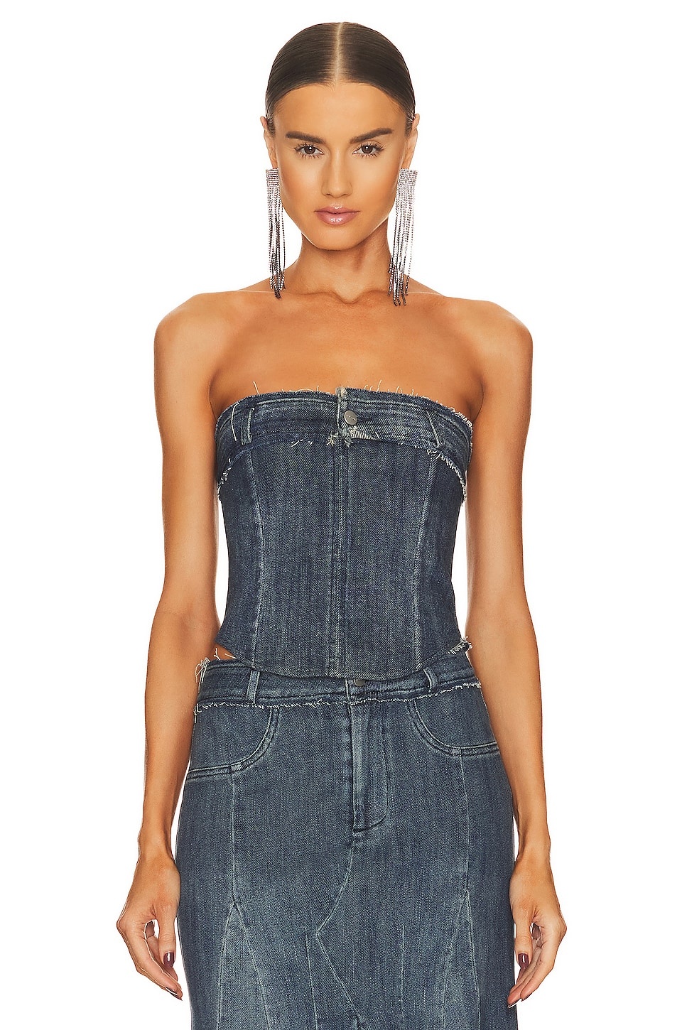 - Self: 93.5% cotton 6% spandex 0.5% lycra Lining: 94% recycled polyester 6% spandex - Made in China - Machine wash - Exposed back zipper closure - Front button closure - Boned bodice - Frayed detail at neckline - Item not sold as a set - Revolve Style No. MAOU-WS139 - Manufacturer Style No. 7068SD2DUR