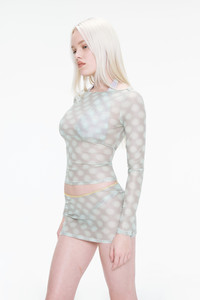 A little fabric that goes a long way. The Elektra Skirt is available in the hottest print of the season, Mint Blurred Dot, made from lightweight mesh. Slip her on with Bali Bikini and the matching long sleeve top for a night on the town. Miaou's bestselling fabric, Power Mesh - 92% Polyester, 8% Spandex Freya is 5'9" and wears a size Small. Her measurements are: Bust-33” Waist-24” Hips-34.5” Machine Wash Cold. Inside Out Gentle Cycle. With Like Colors. Lay Flat To Dry. Do Not Bleach. Warm Iron If Needed.