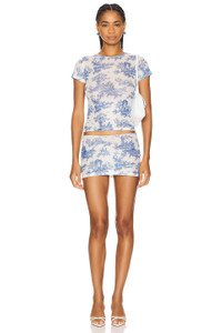 - 92% polyester 8% spandex - Made in China - Machine wash - Unlined - Pull-on styling with elastic waistband - Mesh fabric - Item not sold as set Garment is intentionally sheer, undergarments will show through - Please note undergarment not included - Skirt measures approx 10" in length - Revolve Style No. MAOU-WQ91 - Manufacturer Style No. 4014PM2BLT