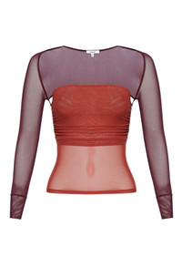 Meet Iris, your new go-to top, in Crimson/Russet. With a cinched center and a detachable bolero, this two-piece long sleeve top is as versatile as it is stylish. Fitted and slightly sheer, Iris is perfect for layering or making a statement on its own. True to size. Please refer to the flat lay image for product accuracy.