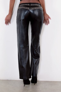 The Josephina Pant is cut low-rise in smooth lamb leather. Finished with pierced detailing and a classic five-pocket design, she’s sleek, edgy, and made to move with you. 100% real lamb leather Jasmine is 5'9" and wears a size S. Her measurements are: Bust-34” Waist-23.5” Hips-34”. Green Dry Clean Only.