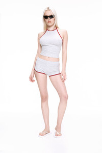 The Kim Short, our newest swim silhouette, in cotton terry. She's a microshort in Heather Grey with red piping. Wear to the pool... or the party. Size up for more coverage. Miaou's new Cotton Terry Swim: 80% Cotton, 20% Polyester Freya is 5'9" and wears a size Small. Her measurements are: Bust-33” Waist-24” Hips-34.5”. Hand Wash Cold. Flat Dry in Shade.