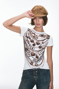 The Mini Tee is back in white, lightweight Tencel jersey, finished with necklace-printed details on the front and back. Soft but bold, she adds a touch of vintage je ne sais quoi to all your outfits. A perfect pair with the Element Pant. Miaou's fan favorite jersey fabric: 95% Tencel, 5% Spandex Amata is 5'7" and wears a size XS. Her measurements are: Bust-30” Waist-23” Hips-34”. Machine Wash Cold. Inside Out Gentle Cycle. With Like Colors. Lay Flat To Dry. Do Not Bleach. Do Not Iron.