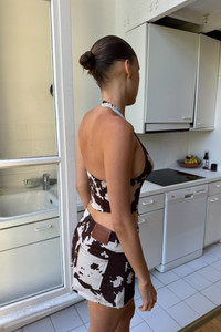 The Miss Mini Skirt - now in Cow Print. Features 4-pocket styling, a Miaou badge, and frayed hem. Miaou's Stretch Canvas: 97% Cotton, 3% Spandex Emilia is 5'5" and wears a size XS. Her measurements are: Bust-29” Waist-24” Hips-35.5”. Dry Clean Only. Do Not Machine Wash.