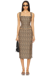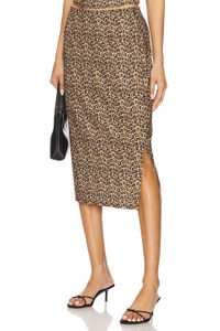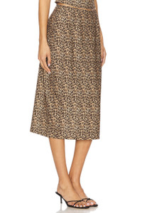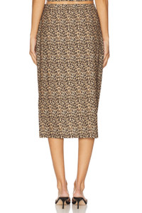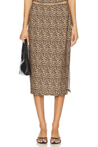 - 97% polyester 3% spandex - Made in China - Machine wash - Unlined - Hidden side zip closure - Side slit detailing - Lightweight crepe fabric Item not sold as a set - Waist to shortest hem measures approx 20" and to longest hem approx 29" in length - Revolve Style No. MAOU-WQ100 - Manufacturer Style No. 4005SCRLEO